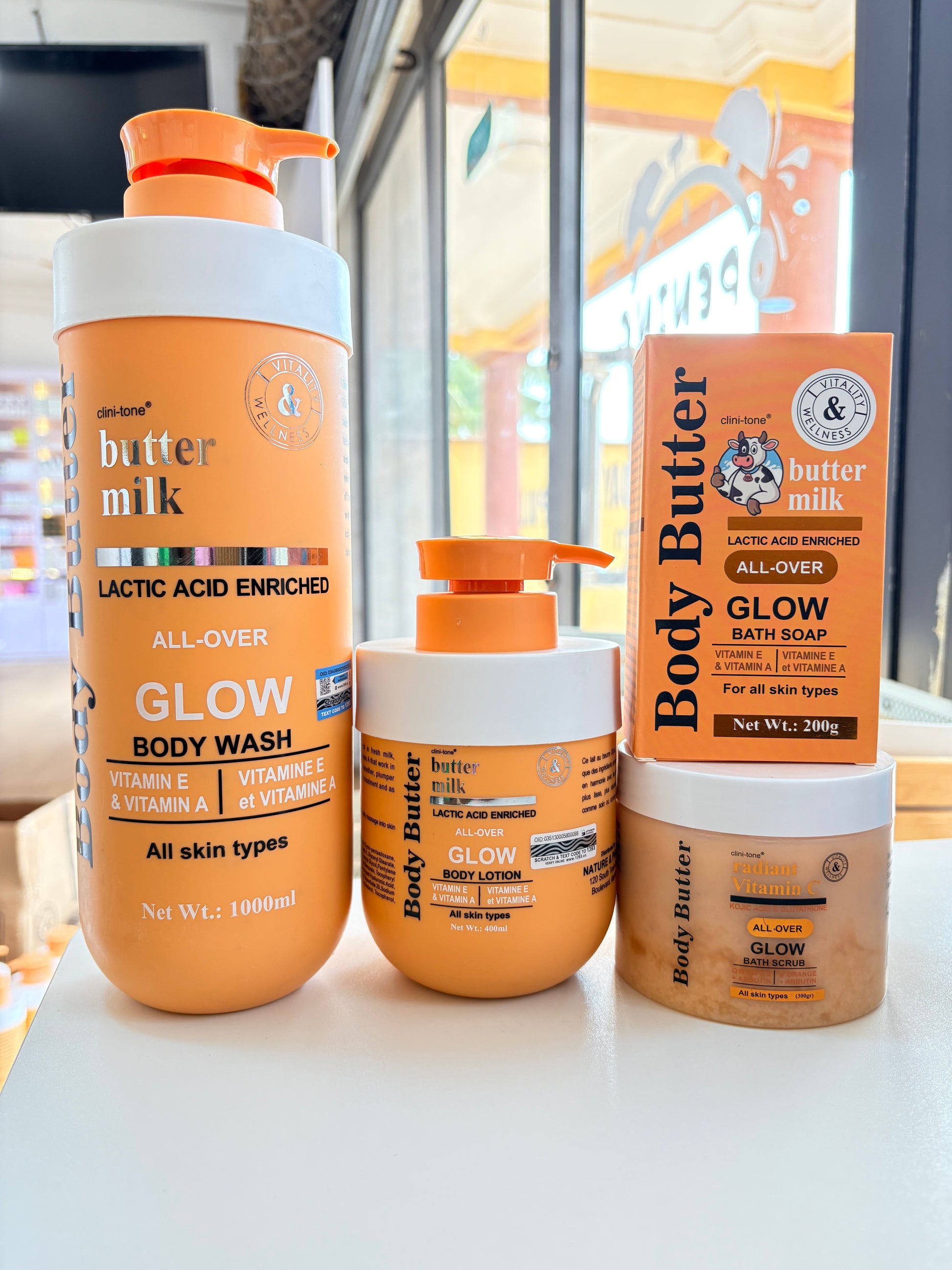 CLINITONE BUTTER MILK GLOW SET ( LOTION, BODY WASH ,BODY SCRUB ,BATH SOAP)