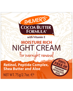 Palmer's Cocoa Butter Formula Moisture Rich Night Cream helps skin to regenerate while you sleep. Containing Natural Cocoa Butter, Retinol and antioxidant Vitamin E, this unique formula promotes softer, smoother skin overnight. Nightly use leaves skin looking more radiant, youthful and healthy.