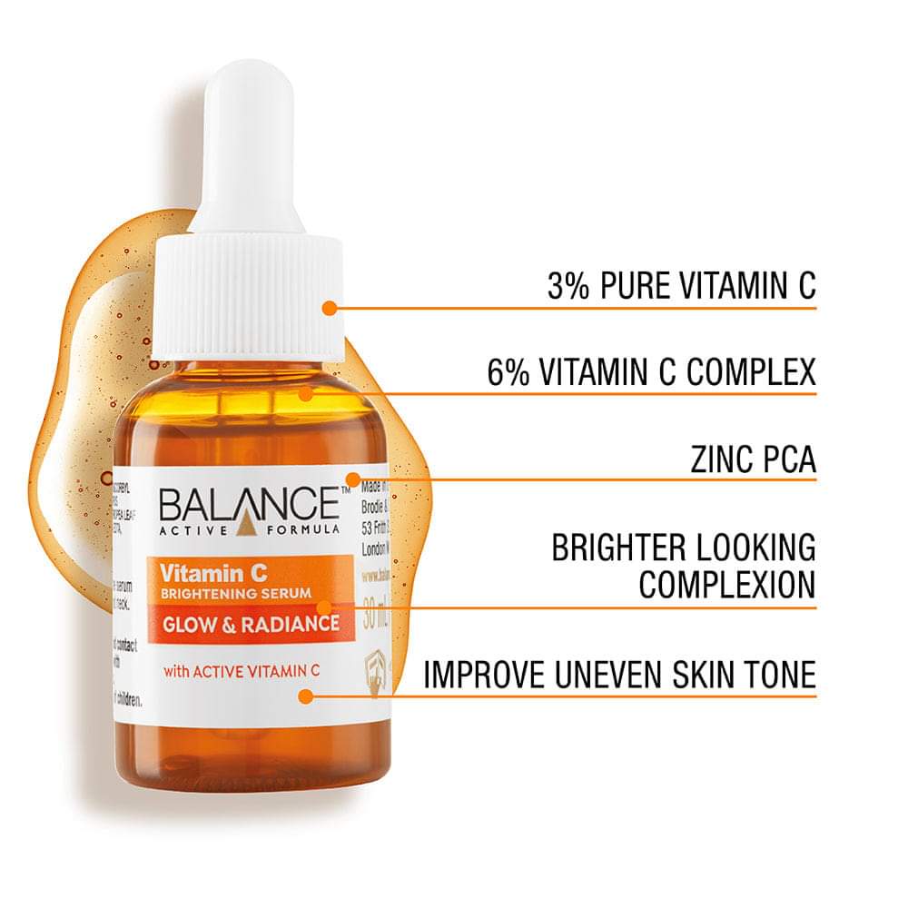 Balance Active Formula Vitamin C Glow and Radiance Brightening Serum. Formulated for a a brighter looking complexion. Skin appears more even and luminous looking skin tone. Gives a glowing and smoother looking skin.