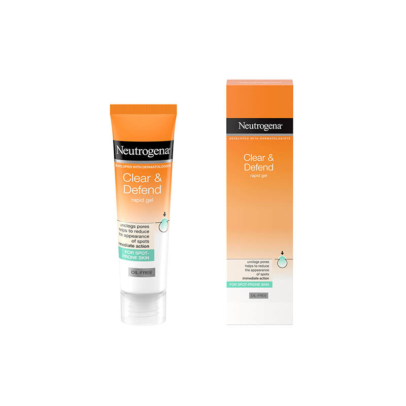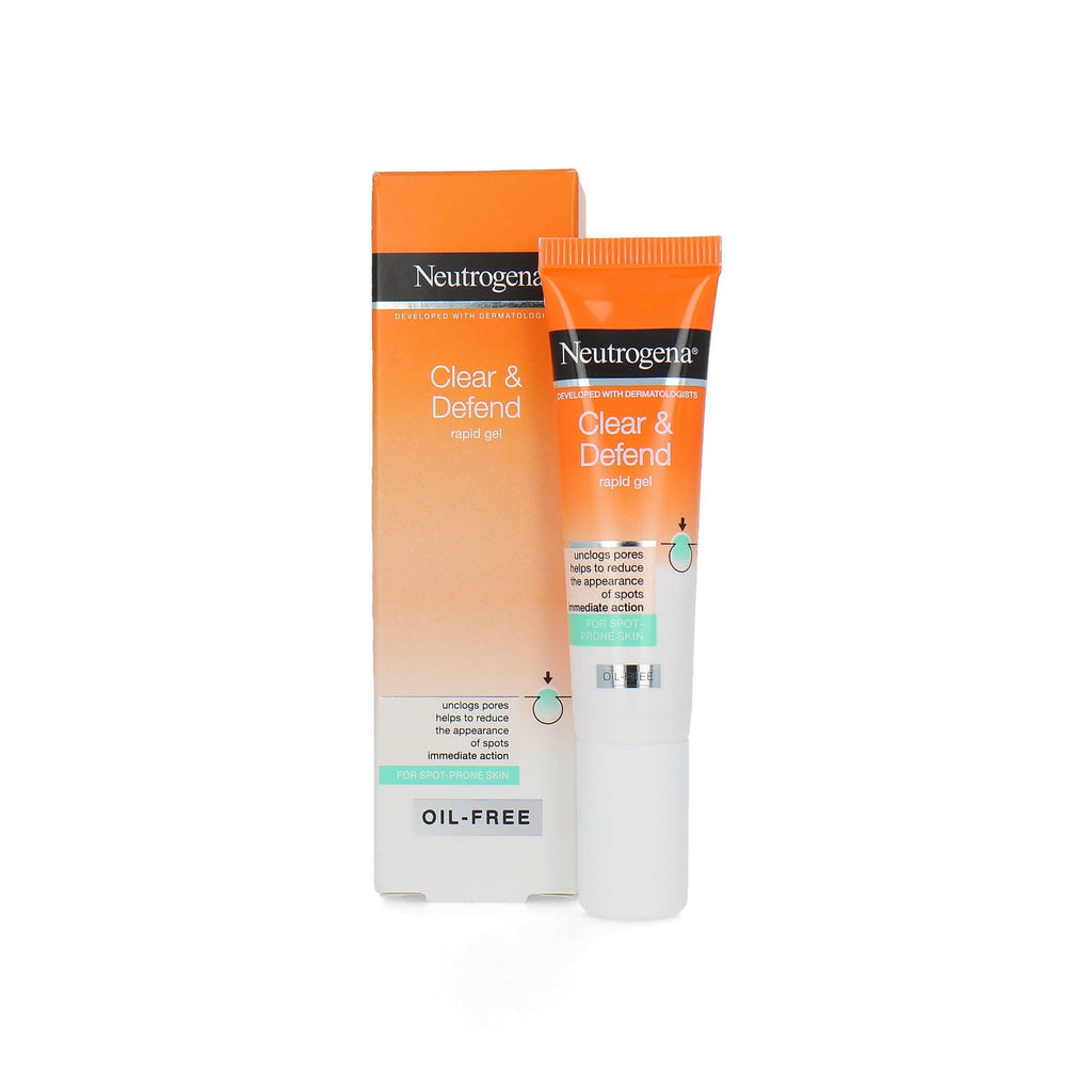 Product Description Neutrogena clear & defend rapid gel is clinically proven to help unclog pores. It's fast absorbing formula containing exfoliating ingredients, quickly reduces excess oil and effectively purifies the skin, all without irritating or over-drying. With daily usage, it helps to reduce the appearance of spots.