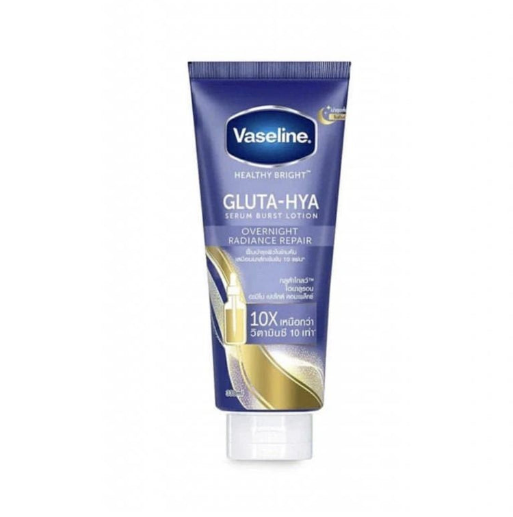 Vaseline Gluta - Hya Over Night Radiance Repair Serum Burst Body Lotion Has Gluta Glow, 10 times more effective than Vitamin C , helping to reduce the cause of dull skin , 10 Times Amino Peptide Complex revitalizes tired skin to look radiant. Vaseline Gluta Jelly helps lock moisture deep in the skin. Restores natural balance to your skin.
